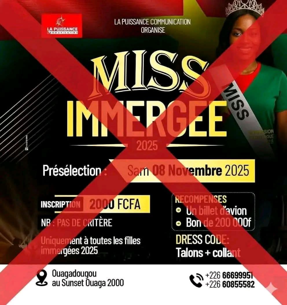 Ouagadougou, 29 octobre 2025 — Le ministère burkinabè de la Communication, de la Culture, desisme a annoncé l’interdiction formelle de l’événement « Miss Immergée 2025 », prévu à Ouagadougou et porté par l’agence La Puissance Communication.
