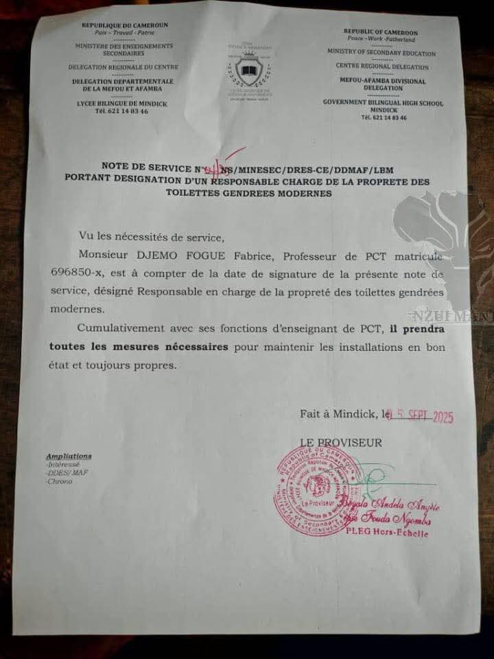 C’est dans une note officielle que le proviseur a désigné M. Djemo Fogué Fabrice, enseignant de PCT, comme responsable des toilettes genrées modernes de l’établissement. En plus de dispenser ses cours, il devra prendre toutes les mesures nécessaires pour maintenir les lieux propres et fonctionnels.