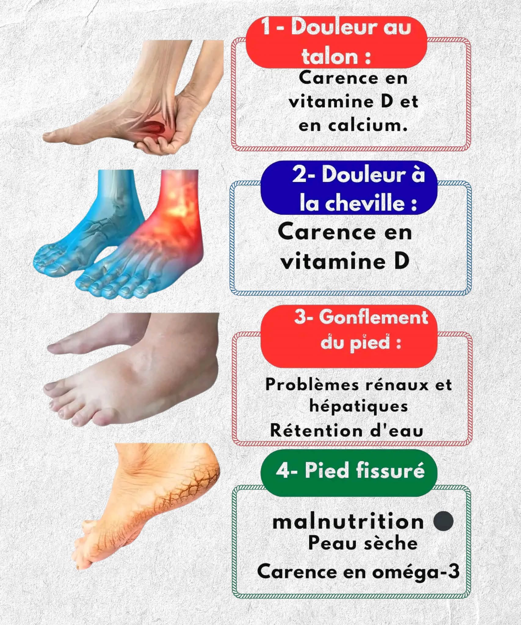 Nos pieds ne sont pas que des piliers de marche ce sont aussi des messagers silencieux de notre état de santé. Douleurs, gonflements ou crevasses peuvent être les signes de carences ou de déséquilibres internes. Voici quatre signaux fréquents à surveiller et leur signification possible :
