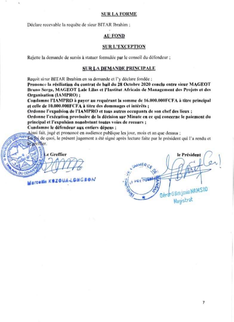 Le litige a émergé suite à un contrat de bail signé le 28 octobre 2020 entre les bailleurs, Monsieur Bruno Serge Mageot et Madame Lale Lilas Mageot, et l’IAMPRO. En effet, le locataire, l’IAMPRO, n’a pas respecté ses engagements financiers en matière de paiement des loyers, s’accumulant à un montant total de 16 millions de FCFA pour les mois d’août à février 2025.
