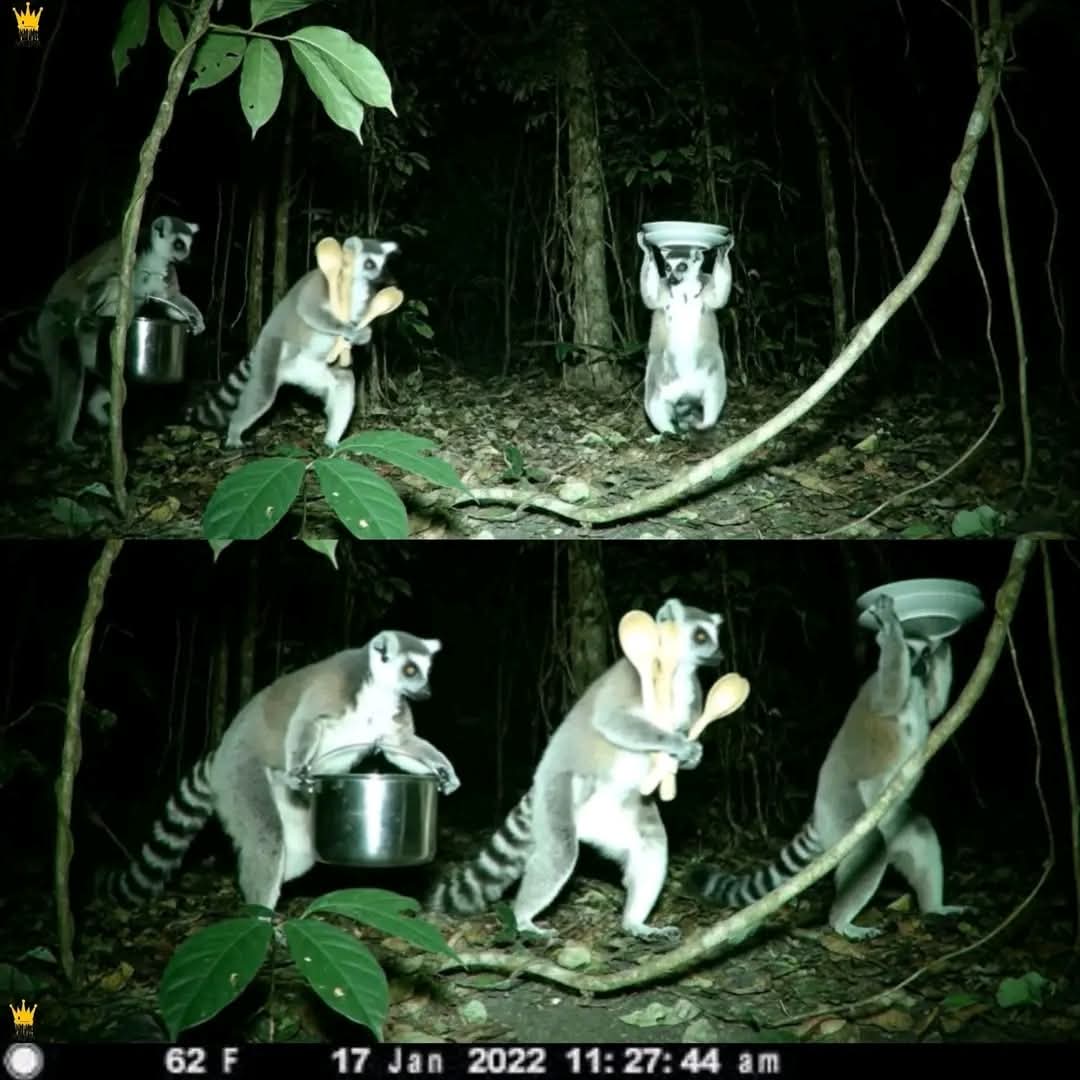 Les images montraient un groupe de lémuriens se faufilant la nuit à travers la forêt, transportant des cuillères, des bols et des casseroles comme une véritable bande de petits cambrioleurs. Les primates semblaient même s’organiser, échangeant des regards complices après chaque “coup réussi”.