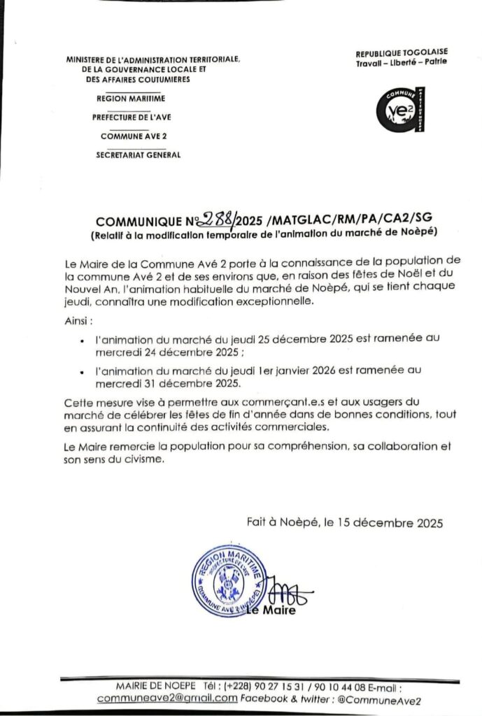 À l’approche des célébrations de Noël et du Nouvel An, la mairie de la Commune Avé 2 annonce une modification exceptionnelle du calendrier du marché de Noèpé. Habituellement organisé chaque jeudi, ce rendez-vous incontournable des commerçants et des habitants sera exceptionnellement déplacé afin de permettre à tous de profiter des festivités dans les meilleures conditions.