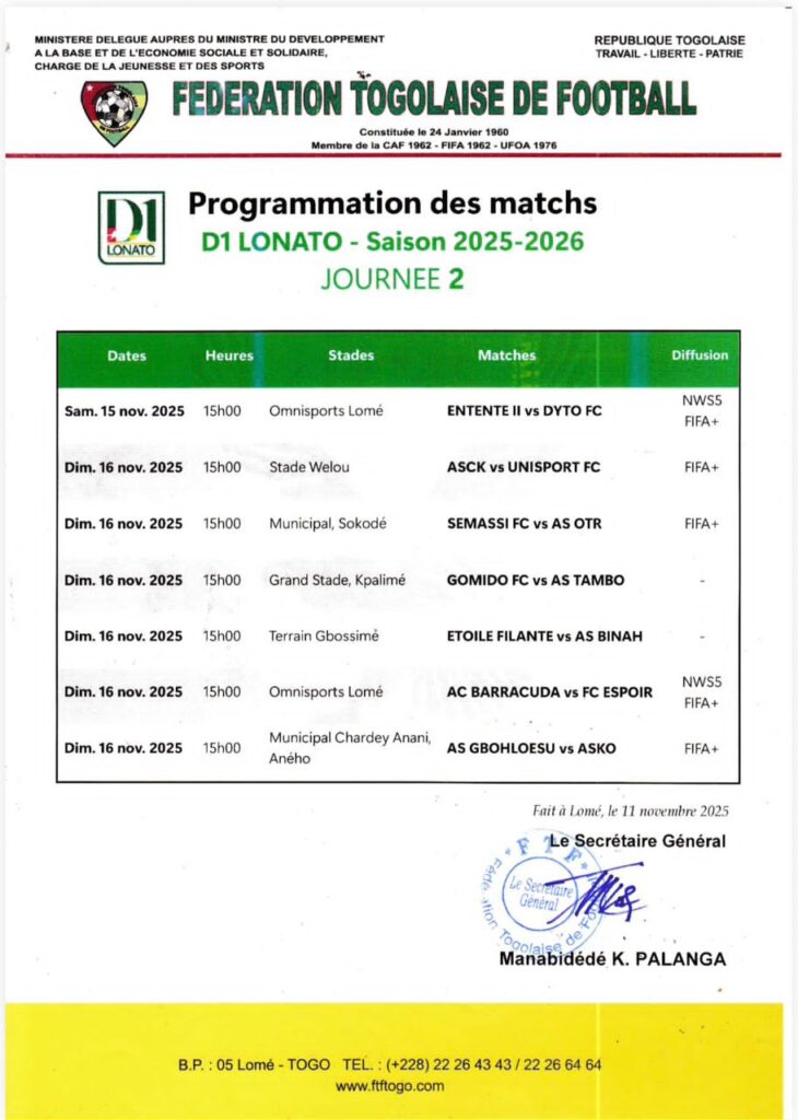 La Fédération Togolaise de Football a dévoilé le programme du week-end des 15 et 16 novembre comptant pour la deuxième journée du championnat national D1-LONATO.