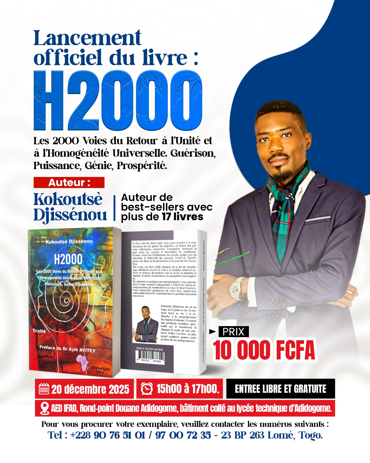 H2000, un voyage littéraire vers l’unité et la connaissance universelle. Le 20 décembre 2025, à Lomé, l’écrivain togolais Kokoutsè Djissénou a présenté son nouvel ouvrage intitulé H2000, Les 2000 Voies du Retour à l’Unité et à l’Homogénéité Universelle. Guérison, Puissance, Génie, Prospérité. La cérémonie de dédicace, organisée avec le soutien de l’Agence Éducation-Développement (AED) et de l’Institut de Formation en Alternance pour le Développement (IFAD), a rassemblé des personnalités du monde de la culture, de l’éducation et de l’édition.