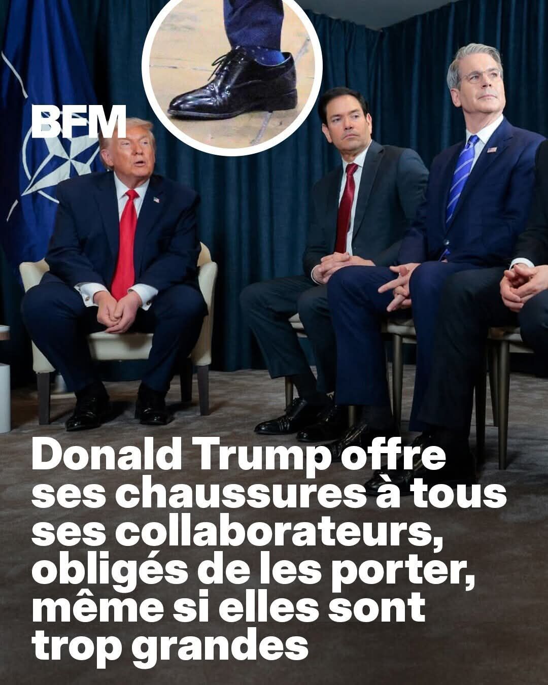 Une image circulant récemment illustre de manière satirique la relation entre Donald Trump et ses collaborateurs. On y voit l’ancien président américain entouré de conseillers, avec une mise en scène particulière : un zoom sur une paire de chaussures trop grandes, accompagnée d’une légende en français indiquant que Trump « offre ses chaussures à tous ses collaborateurs, obligés de les porter, même si elles sont trop grandes ».