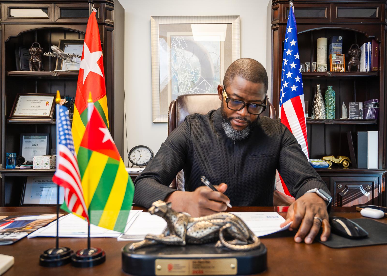 Voilà pour la partie professionnelle et activité de la vie bien remplie de Marc N’da. Il s’est imposé d’évoquer l’essentiel apport de ce prosélyte déterminé et investi dans la lutte de libération de son pays de naissance, le Togo, qui inévitablement est devenue sans merci. En novembre 2024 Marc Nda crée le mouvement populaire « le train de la liberté ». Cet entrepreneur vivant aux Etats-Unis depuis une vingtaine d’années, et qui depuis quelques temps a pris le leadership au sein de la diaspora et immanquablement est devenu la voix de millions de Togolais livrés à eux-mêmes faute d’opposants crédibles sur le territoire national. Présent quotidiennement sur le réseau Tik-Tok pour ressasser le même message envers ses frères et sœurs. Marc Nda est un homme posé, calme, paisible au demeurant mais doté d’un fort sentiment de justice surtout pour son pays. Partisan de la lutte contre la dictature depuis la fin des années quatre-vingt bien avant qu’il ne rallie la terre de l’oncle sam. Les atermoiements et imbroglio incessants au sein des différents partis politique d’oppositions on finit de le pousser dans l’arène. Il se sent irrévocablement la force de conduire le mouvement, chose qu’il fait parfaitement jusqu’à lors.